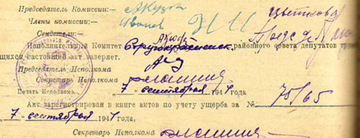 Из акта об убытках от немецко-фашистских захватчиков колхоза «Красный борец» Симанологского с/с Струго-Красненского района за 20 мая 1944 года