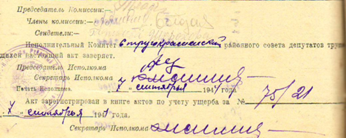 Из акта об убытках от немецко-фашистских захватчиков колхоза «Красные Бахуни» Павского с/с Струго-Красненского района за 21 мая 1944