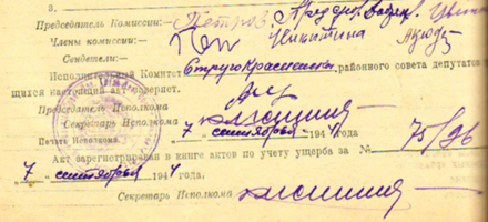Из акта об убытках от немецко-фашистских захватчиков колхоза «Новое Бельско» Озеревского с/с Струго-Красненского района за 25 мая 1944 года