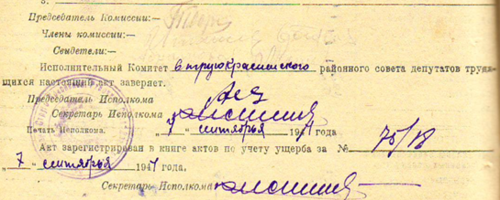 Немецко-фашистские захватчики по приказу майора Шиплера в 1941 года прибыли в нашу деревню и забрали: 31 корову, 32 теленка, 31 свинью, 20 овец, 151 кур, 90 семей пчел и т. д.; продуктов питания: 5 т. хлеба, 20 т. картофеля и т.д. Вместе с тем сожгли и уничтожили: жилых домов 1, скотных дворов 3, амбаров 5, гумна и риги 2, сараев 7 и т.д. Уничтожили сельхозинвентаря: плугов 20, борон 14, сеялки 1, сенокосилок 2, конные грабли 3, жнеек 2, молотилок 1, сортировок 12, льномялок 2, телег 14, саней 8, сбруй 18.