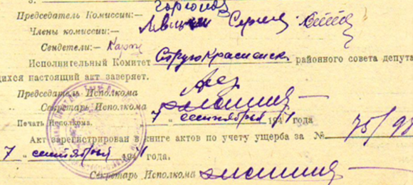 Из акта об убытках от немецко-фашистских захватчиков колхоза «Красная Череминка» Всинского с/с Струго-Красненского района за 17 мая 1944 года