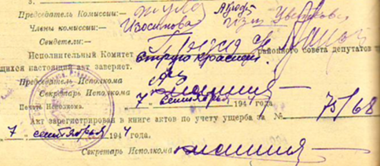 Из акта об убытках от немецко-фашистских захватчиков колхоза «Красный дубок» Симанологского с/с Струго-Красненского района за 21 мая 1944 года