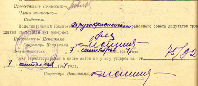 Из акта об убытках от немецко-фашистских захватчиков колхоза «Дуброво» Логовещенского с/с Струго-Красненского района за 26 мая 1944 года