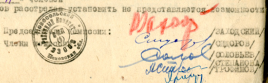 Мы нижеподписавшиеся районная комиссия по установлению и расследованию злодеяний причинённых немецко-фашистскими захватчиками в Новосельском районе Псковской области в составе председателя комиссии ЗАХОДСКОГО В. И., членов комиссии: СИДОРОВА Ф. М., СОЛОВЬЕВА П. Т., СТЕПАНОВОЙ А. П., ТРОФИМОВА Г. Г., составили настоящий акт на основе актов составленных гражданами Цапельского с/совета Новосельского района свидетельствующих и кровавой расправе немецких властей над мирным население в этом с/совете.