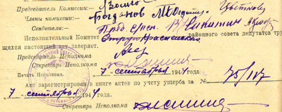 Из акта об убытках от немецко-фашистских захватчиков колхоза «Северный комбайн» Яблоницкого с/с Струго-Красненского района за 30 мая 1944 года