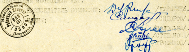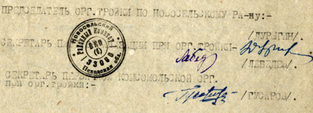 Мы нижеподписавшиеся: Председатель Оргстройки Новосельского района Н. П. ДУРЫГИН, Секретарь первичной партийной организации Г. К. ЛЕБЕДЕВ и секретарь первичной комсомольской организации И. П. ГУСАРОВ составили настоящий акт.По приказу Коменданта Новосельской Районной Комендатурыы ГРУБОВСКОГО расстреляли:КУЛАКОВА Тимофея Григорьевича 1884 года рождения 10 августа 1943 года житель деревни Корсаково