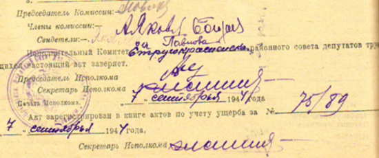 Из акта об убытках от немецко-фашистских захватчиков колхоза «Дружный» Логовещенского с/с Струго-Красненского района за 26 мая 1944 года