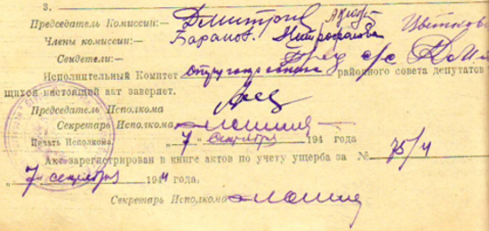 Из акта об убытках от немецко-фашистских захватчиков колхоза «Кр. Остров» Сиковицкого с/с Струго-Красненского района за 24 мая 1944 года.