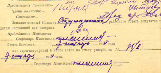 Из акта об убытках от немецко-фашистских захватчиков колхоза «Уус-Погорелка» Сиковицкого с/с Струго-Красненского района за 25 мая 1944 года
