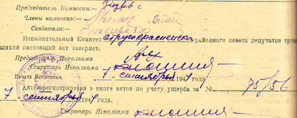 Из акта об убытках от немецко-фашистских захватчиков колхоза «День Ленина» Хрединского с/с Струго-Красненского района за 18 мая 1944 года