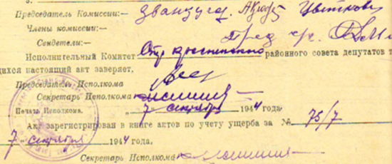 Из акта об убытках от немецко-фашистских захватчиков колхоза «Красный комбайн» Сиковицкого с/с Струго-Красненского района за 24 мая 1944 года