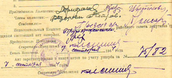 Из акта об убытках от немецко-фашистских захватчиков колхоза «Река» Симанологского с/с Струго-Красненского района за 22 мая 1943 года