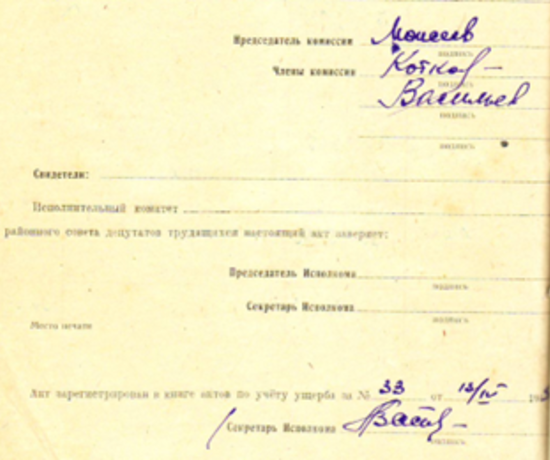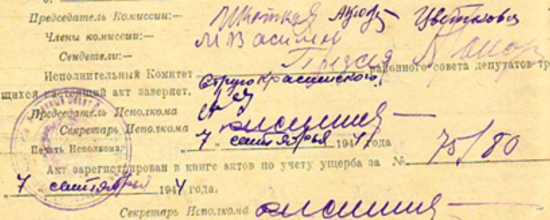 Из акта об убытках от немецко-фашистских захватчиков колхоза «Новая жизнь» Симанологского с/с Струго-Красненского района за 30 марта 1945 года