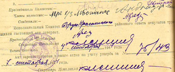Из акта об убытках от немецко-фашистских захватчиков колхоза «Заря будущего» Запольского с/с Струго-Красненского района за 16 мая 1944 года