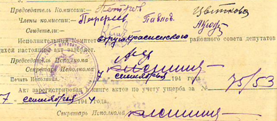 Уничтожено построек: скотных дворов 2. Уничтожено с/ хоз инвентаря: сенокосилок 1, конных граблей 1, жнеек 1, льномялки 1, телеги 5 ,саней 8, пожарных машин 1. Угнано скота: бык 1, коров 7, телят 9, баран 1, овец 20, ягнят 14 и т. д. Забрано с/хоз запасов: зерновых 1725 пуд., картофеля 1800 пуд., льносемя 245 пуд., овощей 1350 пуд., сено 840 пуд., соломы 672 пуд.