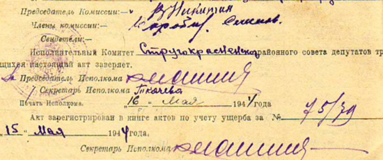 Из акта об убытках от немецко-фашистских захватчиков колхоза «Новый Щир» Яблоницкого с/с Струго-Красненского района за 27 мая 1944 года