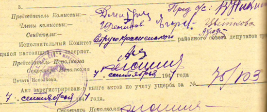 Из акта об убытках от немецко-фашистских захватчиков колхоза «Скороход» Яблоницкого с/с Струго-Красненского района за 31 мая 1944 года