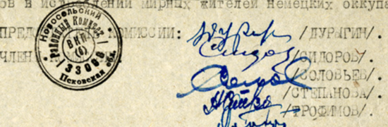 Мы нижеподписавшиеся Районная комиссия по установлению и расследованию злодеяний немецко-фашистских оккупантов на территории Новосельского района, Псковской области, в составе председателя комиссии – ДУРЫГИНА, членов комиссии СИДОРОВА Ф. М., СОЛОВЬЕВА П. Т., СТЕПАНОВА А. П. и ТРОФИМОВА Г. Г., на основе актов представленных Молодейским с/с Новосельского района составили настоящий акт на злодеяния совершенные немецко-фашистскими оккупантами на территории Молодейского с/с над мирными жителямиКак подтверждают в своем акте граждане: ЗАХАРОВА, ФЕДОРОВА, КОЛБАСОВА, ДУРОВА, НИКОЛАЕВ, 30 декабря 1943 года немецкий карательный отряд окружил деревню Углы, арестовал ИВАНОВА И. И., после чего он был расстрелян в лесу. Факт расстрела ИВАНОВА подтверждает его жена КО[Л]БАСОВА принимавшая участие в составлении акта. 16 ноября 1943 года карательный отряд немцев арестовал в деревне Углы МОИСЕЕВА И. Я. 1900 года рождения и расстрелял его в лесу, факт расстрела МОИСЕЕВА в числе двух граждан деревни подтверждает его жена МОИСЕЕВА, подписавшая акт.3 декабря 1943 года вместе с ИВАНОВЫМ был арестован и расстрелян в лесу ВАСИЛЬЕВ Петр Иванович 1910 года рождения. В составленном акте на расстрелянного ВАСИЛЬЕВА принимала участие его жена ВАСИЛЬЕВА. На основании заявления граждан деревни Углы РАДИОНОВОЙ был составлен акт на то, что ее сын НИКОЛАЕВ Михаил Петрович 1903 года рождения был арестован и расстрелян в лесу немецким карательным отрядом, факт расстрела НИКОЛАЕВА подтверждают в составленном акте МАЛЕЕВА М. И. и НИКОЛАЕВ П. 12 декабря 1943 года прибывший в деревню Углы немецкий карательный отряд арестовал гражданина ЕГОРОВА И. Е. отвезя на автомашине в лес – расстреляли. Этот факт подтверждают жена расстрельного ЕГОРОВА Е. Т. и группа граждан деревни Углы.