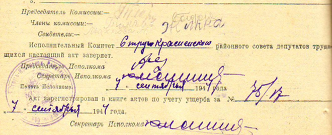 Из акта об убытках от немецко-фашистских захватчиков колхоза «Коллективный труд» Павского с/с Струго-Красненского района за 22 мая 1944 года