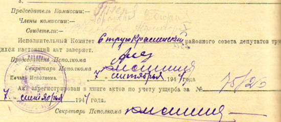Из акта об убытках от немецко-фашистских захватчиков колхоза «Новый путь» Павского с/с Струго-Красненского района за 20 мая 1944