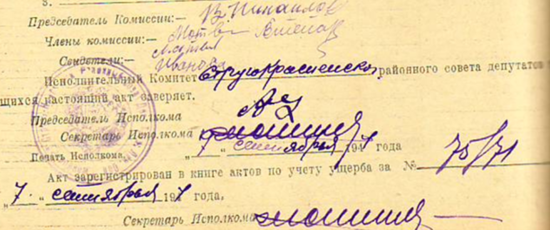 Из акта об убытках от немецко-фашистских захватчиков колхоза «Союз» Боротненского с/с Струго-Красненского района за 23 мая 1944 года