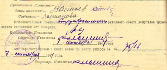 Из акта об убытках от немецко-фашистских захватчиков колхоза «Памяти Ленина» Павского с/с Струго-Красненского района за 21 мая 1944 года.