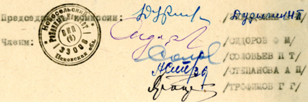 Мы ниже подписавшиеся Районная комиссия по установлению и расследованию злодеяний немецко-фашистских захватчиков за время оккупации Новосельского района в составе председателя Районной комиссии - Дурыгин, членов – СИДОРОВА, СОЛОВЬЕВА, СТЕПАНОВОЙ и ТРОФИМОВА на основе заявлений граждан деревни «Жихловичи» Катежинского с/совета Новосельского района медицинской сестры ФАДЕЕВОЙ Марии Ивановны, фельдшера МИЛЬТУС, ДМИТРИЕВОЙ, составили настоящий акт на злодеяния совершенные немецко-фашистскими на территории деревни «Жихловичи». Отступая под ударами Красной Армии отряд немецко-фашистских войск 23 февраля 1944 года застал на мельнице «Митря[ш]ева» группу мирных граждан в количестве 11 человек, согнал их в мельницу, а мельницу поджег, в результате заживо сгорели: мельник СТЕПАНОВ Иван Федорович 34 лет, его жена и двое детей в возрасте от 4 и 3 лет, гр-ка АНИСИМОВА 58 лет, МИХАЙЛОВА Анна Максимова 34 года, остальных 5 человек фамилии установить не удалось.